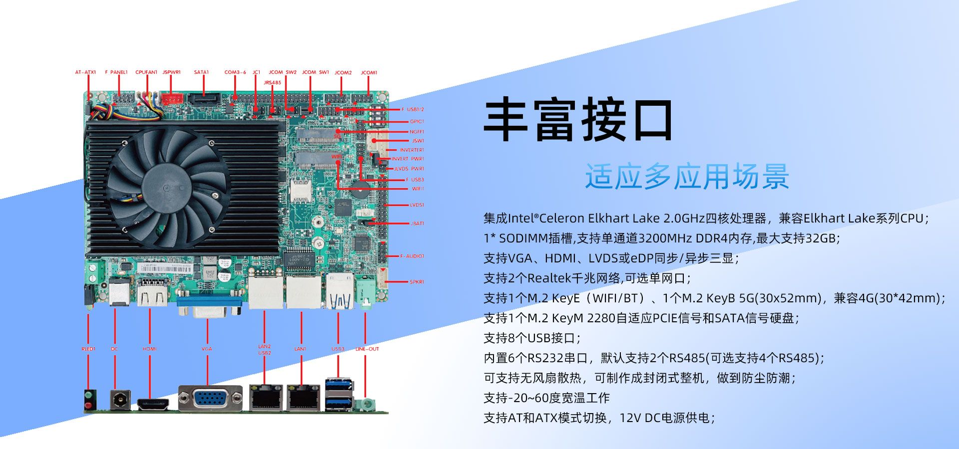 | Wireless | 1* Mini-PCIe slot (supports half/full size cards), supports WIFI/4G modules | |